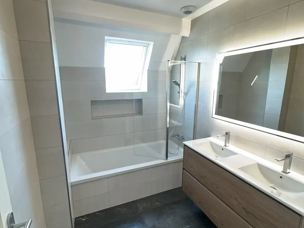 Le meuble vasque accompagné de son miroir est fourni par Kyrya, complété par une bonde clic-clac MZ. Pour le confort, un sèche-serviettes Irsap a été installé. Enfin, les accessoires WC Clou et le WC posé au sol Geberit finalisent l’ensemble.