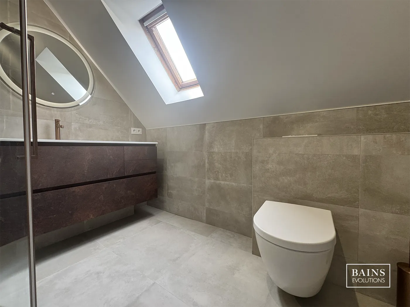 Le miroir rond Manillon Torrent avec éclairage intégré et fonctions tactiles modernise l’ensemble, tandis que le sèche-serviettes Irsap gris anthracite structure l’espace avec élégance. Les équipements WC sont intégrés via le système Geberit, garantissant confort et fiabilité.
