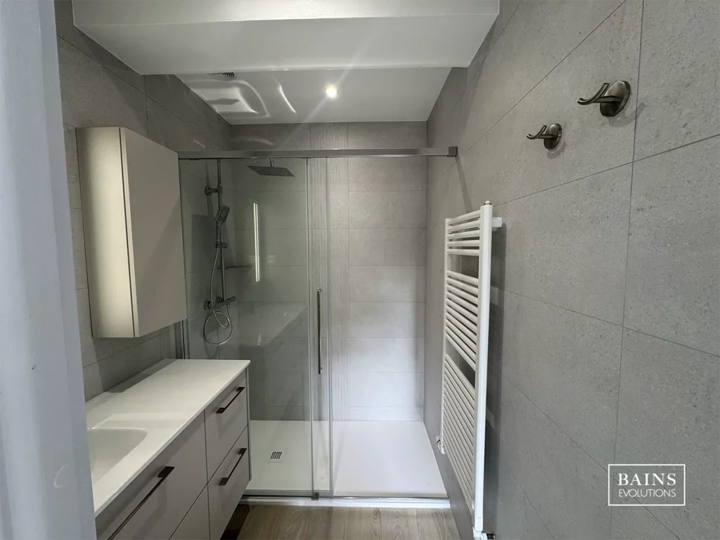 Le sol est habillé d’un carrelage Peronda effet bois clair (19,5 x 121 cm), posé façon parquet, accompagné de plinthes assorties aspect bois clair pour une finition fluide et chaleureuse. Les murs en faïence Navarti aspect pierre blanc grand format apportent luminosité et élégance, soulignés par des profilés de finition Profilpas en argent poli brillant.